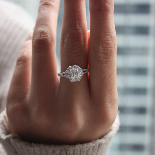 Emerald Cut Halo Moissanite Ring | 18K Gold Plated Sterling Silver