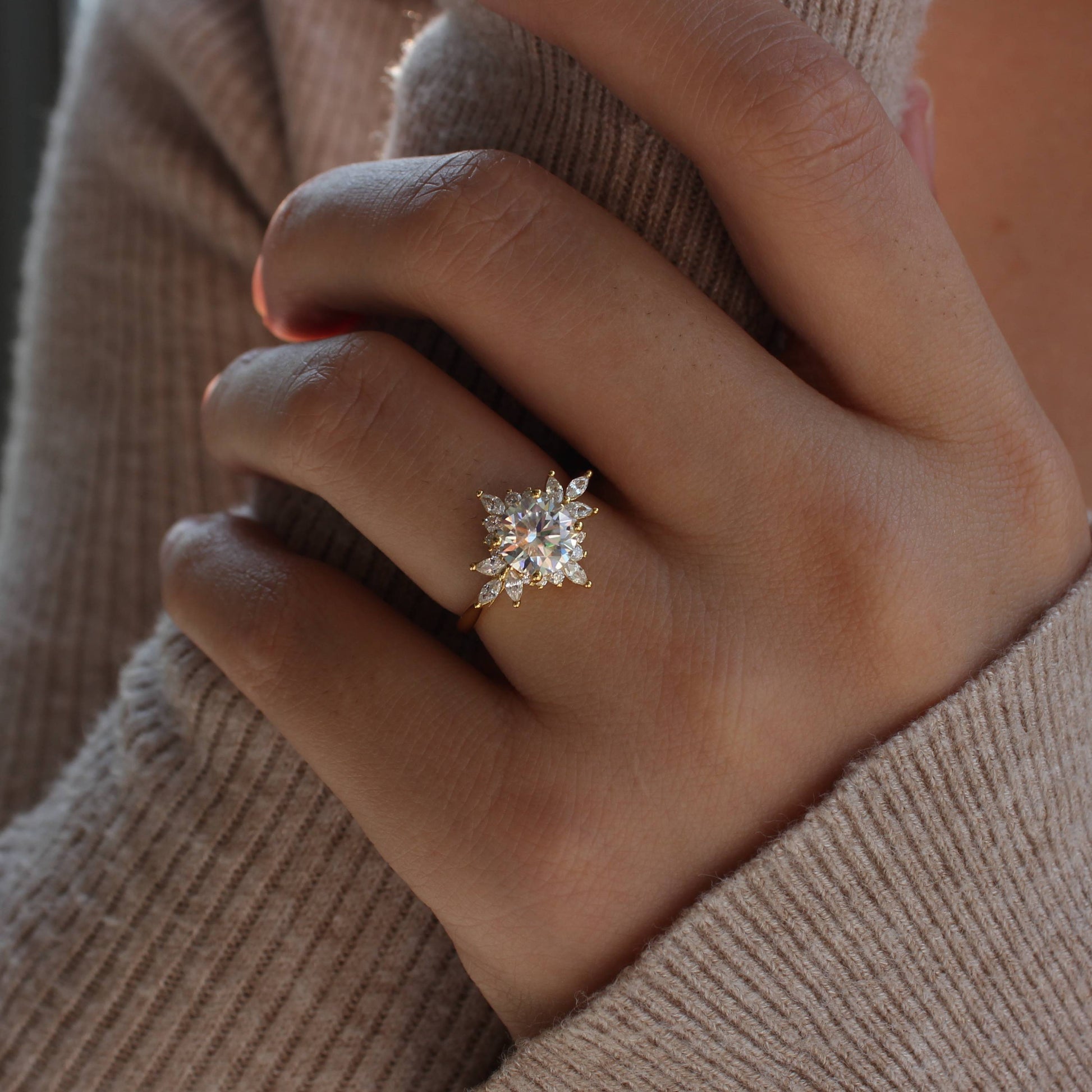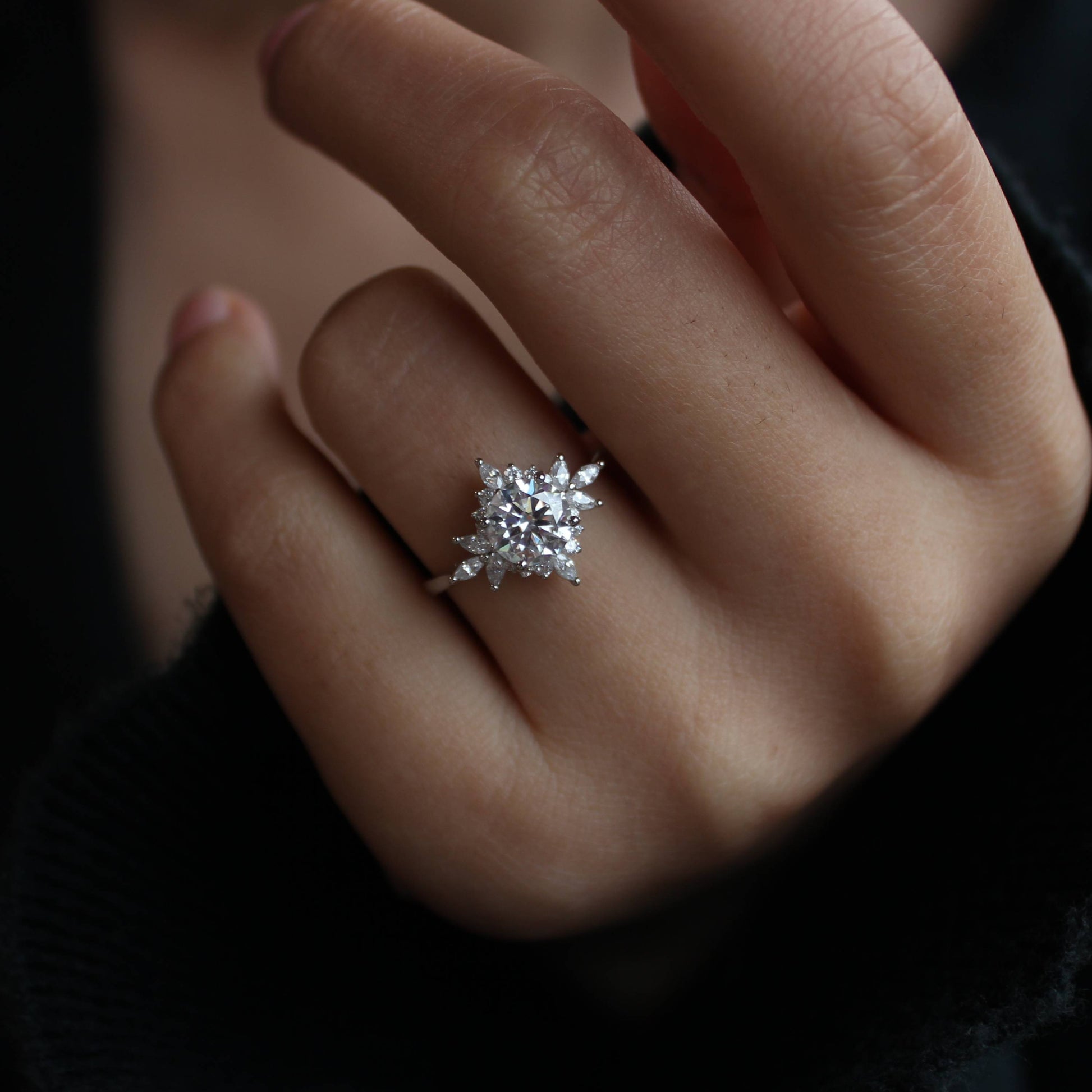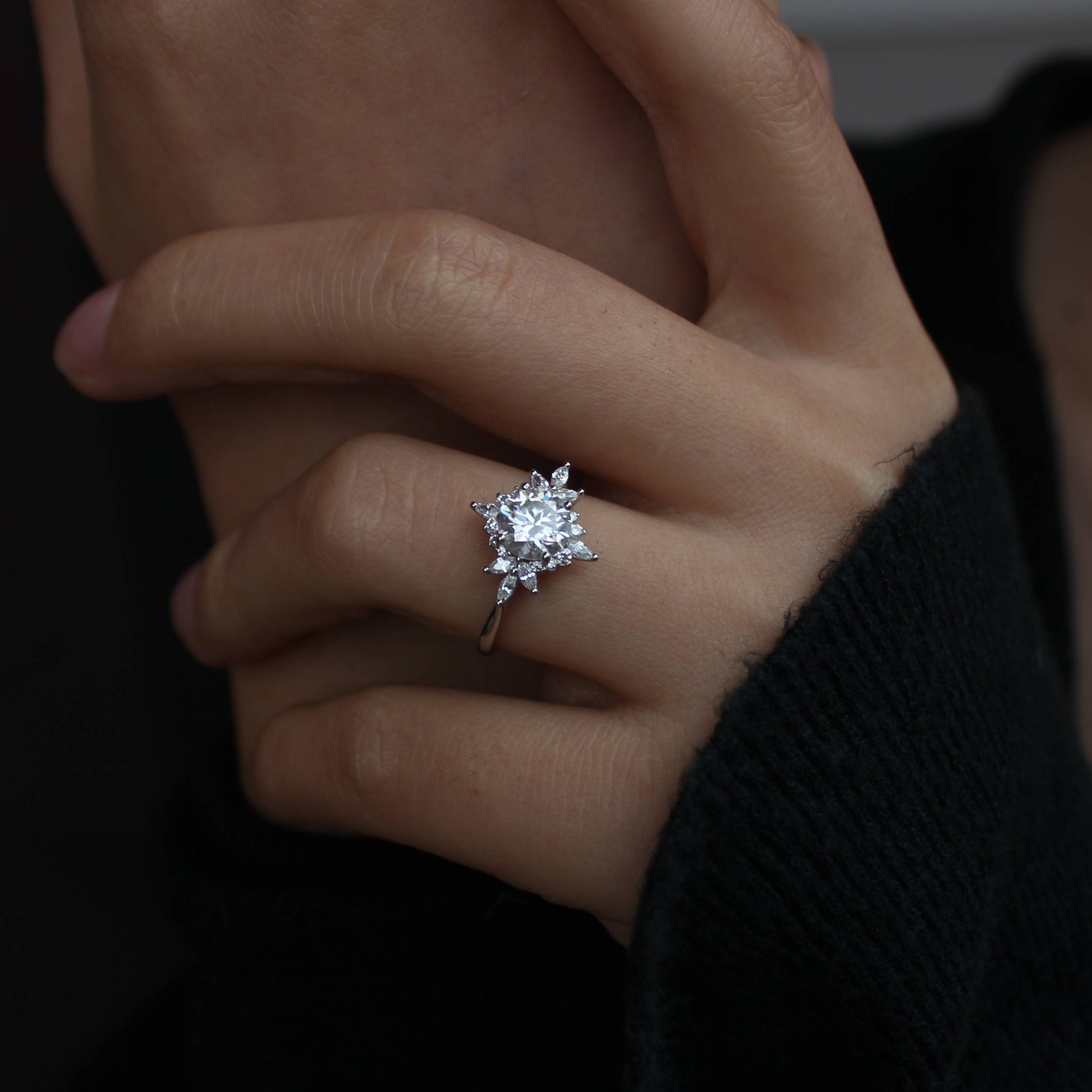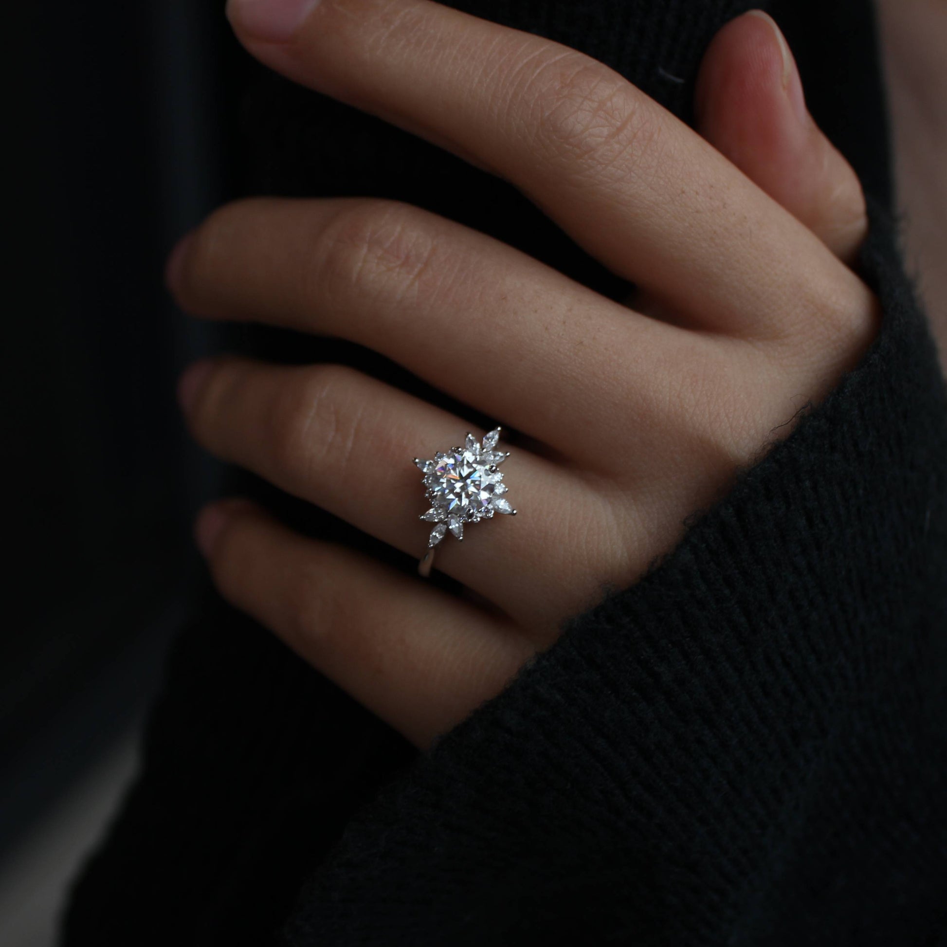 This floral halo ring features a brilliant moissanite center stone, accented with delicately arranged zircon stones that form a petal-inspired silhouette around the center.