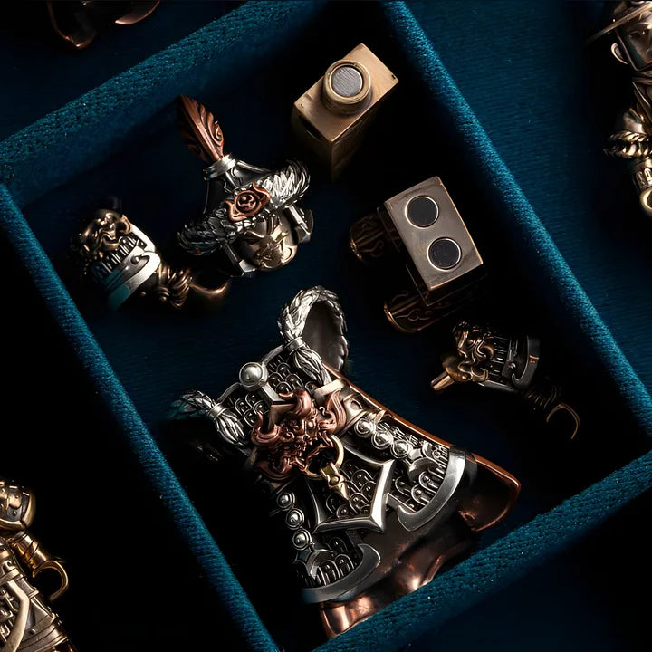 Design: Imperial warrior–inspired metal collectible with engraved armor, ceremonial helmet, and symbolic chest emblem