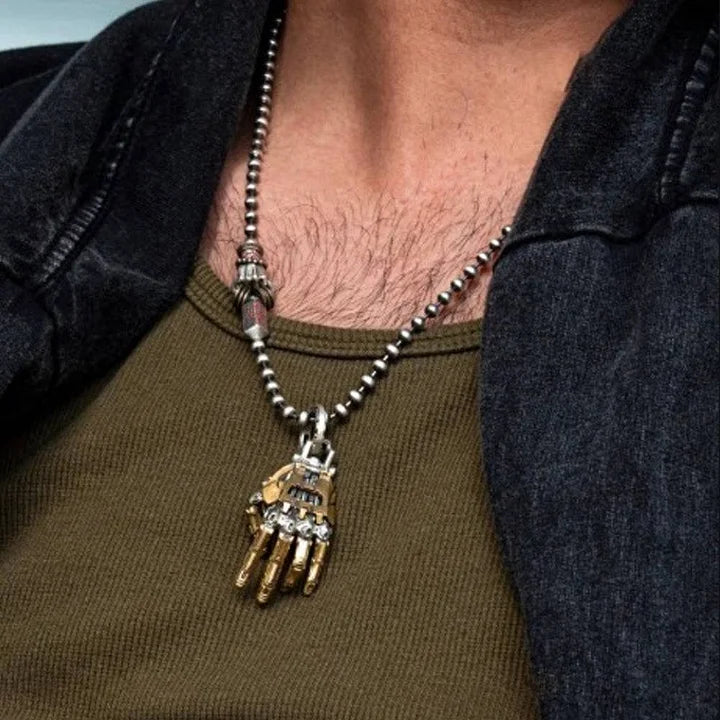 The Mechanical Hand Pendant is a fully articulated miniature metal sculpture, designed with movable joints that allow expressive positioning while maintaining a solid, sculptural feel.