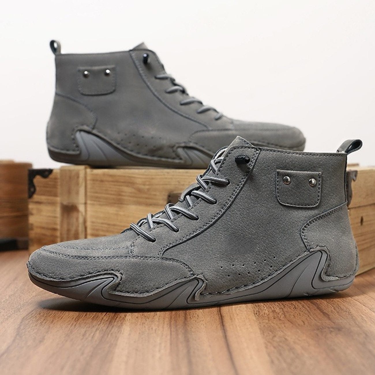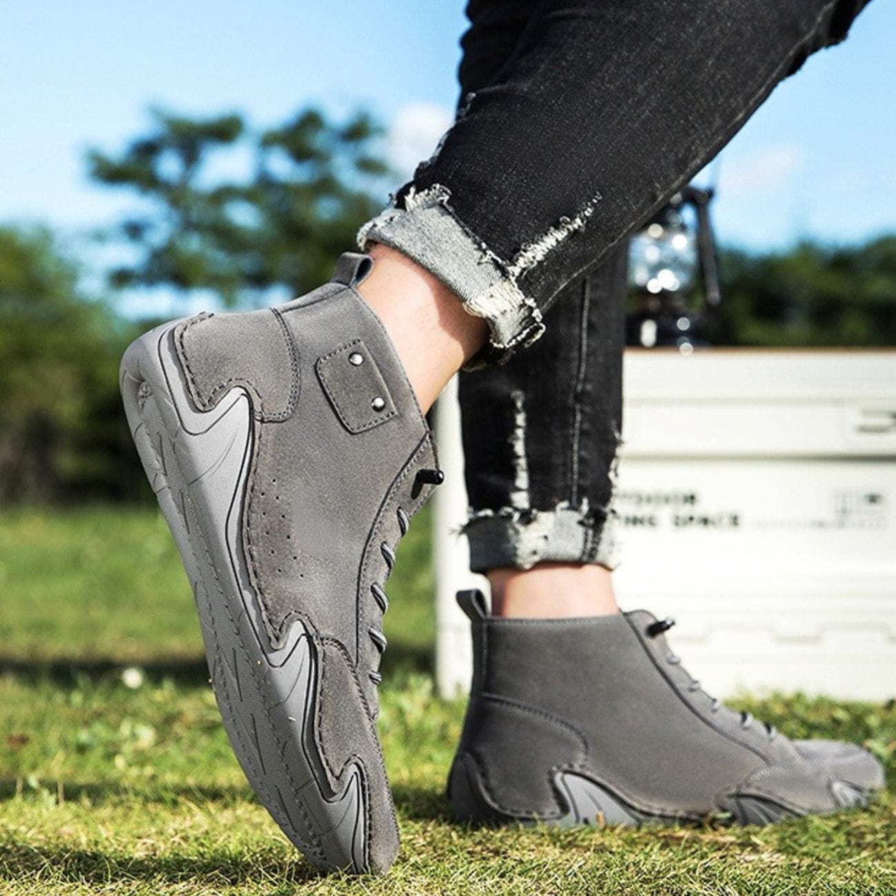 Step into natural comfort with the OMYEESE high-top barefoot hiking boots. Made from durable waterproof suede leather, these shoes protect your feet while allowing natural movement for long walks, camping or casual outdoor adventures. The flexible zero-drop sole supports a barefoot feel, while the padded ankle collar offers extra stability on uneven ground. Lightweight, slip-resistant and built for all-day wear — perfect for hiking, driving or daily urban exploring.