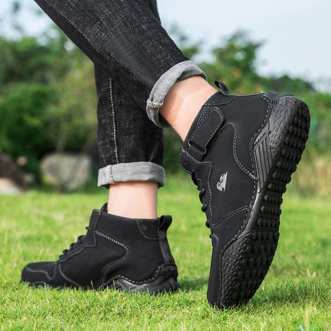 Step into natural comfort with the OMYEESE high-top barefoot hiking boots. Made from durable waterproof suede leather, these shoes protect your feet while allowing natural movement for long walks, camping or casual outdoor adventures. The flexible zero-drop sole supports a barefoot feel, while the padded ankle collar offers extra stability on uneven ground. Lightweight, slip-resistant and built for all-day wear — perfect for hiking, driving or daily urban exploring.